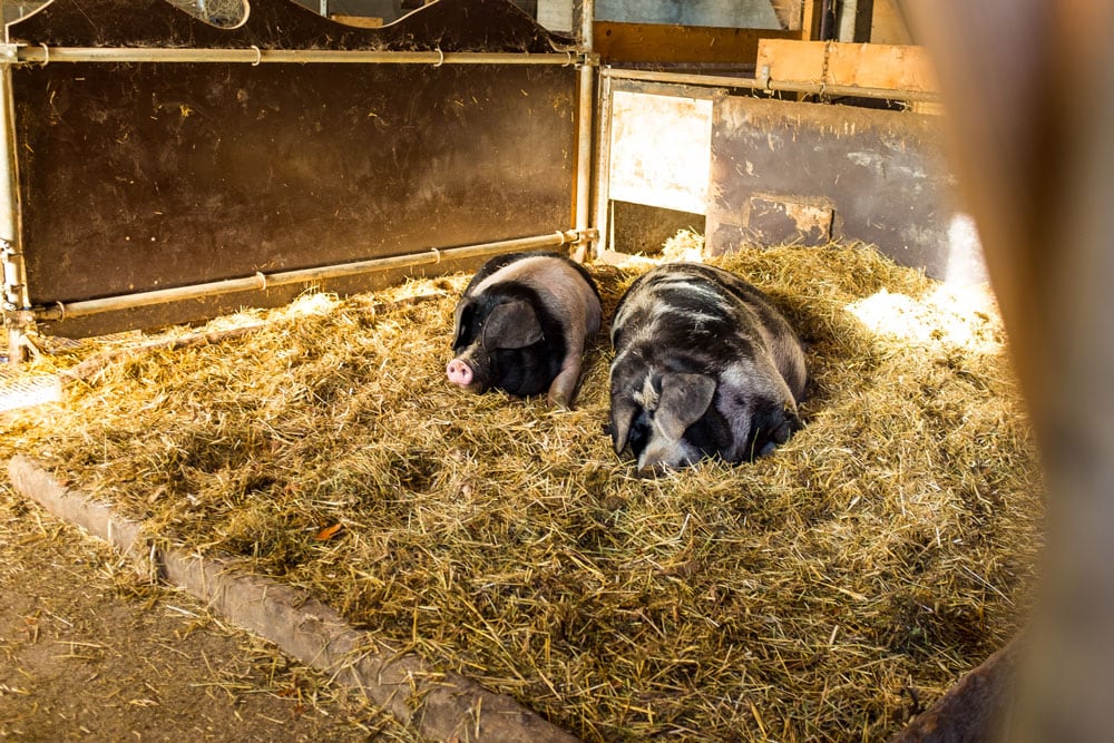 Zwei Muttersäue der selbst gezüchteten Rasse «Buntes Distelschwein»: Sie sind robuster als die normalen rosa Schweine, auch weil sie wieder eine angemessene Fettschicht haben, was den konventionellen Schweinen auf Wunsch des Detailhandels weggezüchtet wurde.