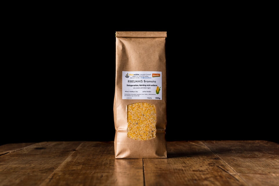 - Quality features: Die Bramata wird aus einer alten Landmaissorte, dem Ribelmais hergestellt und in der Steinmühle gemahlen.