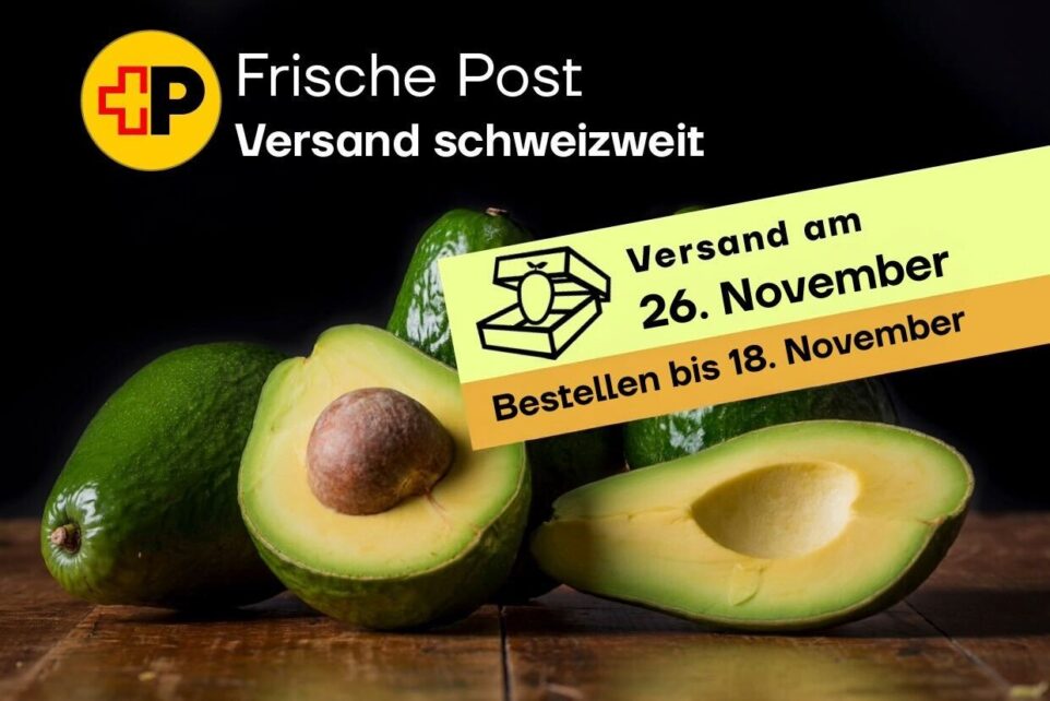 Schweizweit liefern wir dir diese Früchte per A-Post direkt an deine Haustür! Deine Früchtebox wird am Mittwoch, 26. November, der Post übergeben und trifft voraussichtlich bereits am Folgetag, dem Donnerstag, 27. November, bei dir ein. Bitte beachte, dass sich die Zustellung in Ausnahmefällen um einen Tag verzögern kann.