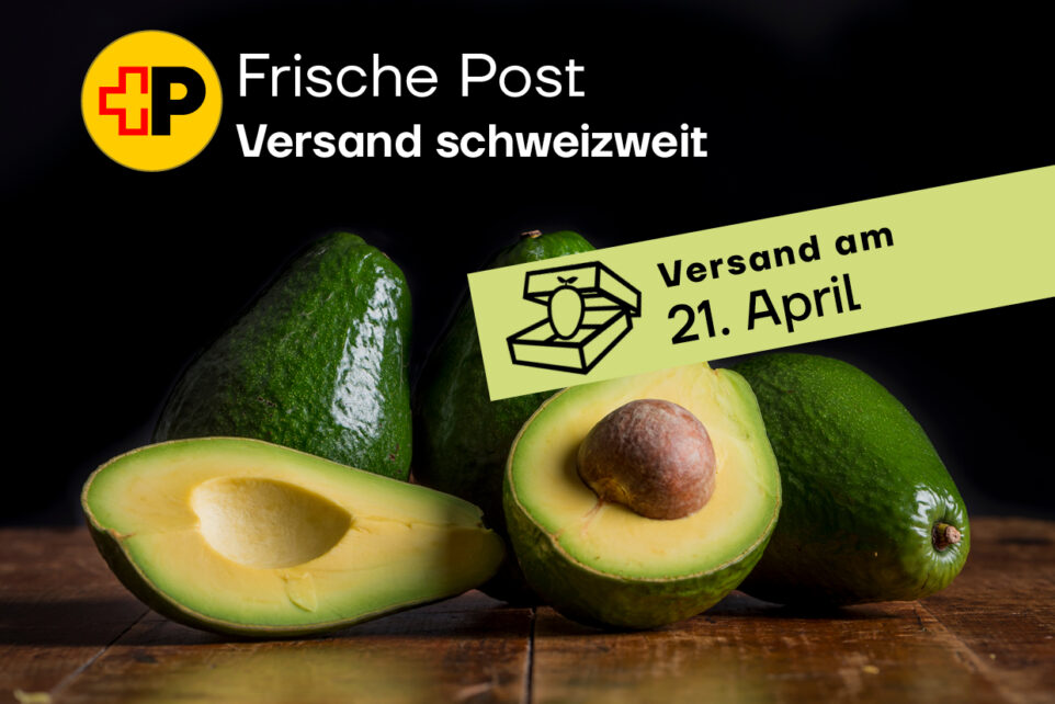 Schweizweit liefern wir dir diese Früchte per A-Post direkt an deine Haustür! Deine Früchtebox wird am Dienstag, 21. April, der Post übergeben und trifft voraussichtlich bereits am Folgetag, dem Mittwoch, 22. April, bei dir ein. Bitte beachte, dass sich die Zustellung in Ausnahmefällen um einen Tag verzögern kann.