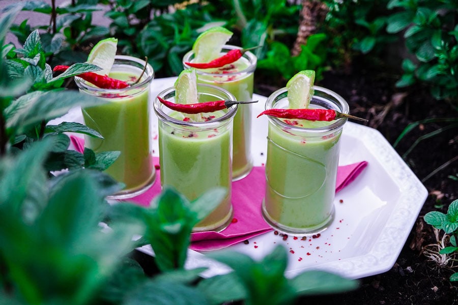 - Jetzt wird alles püriert. Wenn du die Suppe warm servieren möchtest, dann serviere sie sofort; bei erneutem Aufwärmen besteht die Gefahr, dass die Suppe bitter wird. Du kannst sie mit Chilischoten, Limetten und roten Pfefferkörner dekorieren.