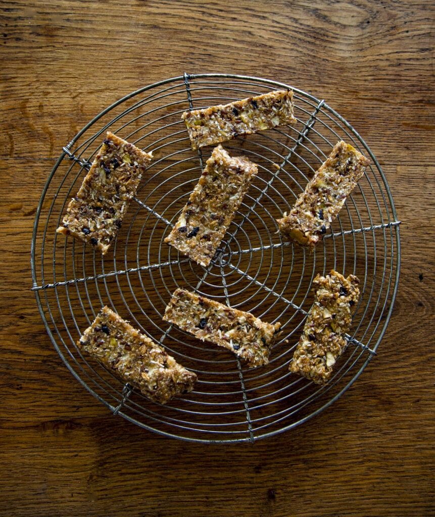 dem Abkühlen in riegelförmige Stücke schneiden. Die Früchteriegel sind eher weich. Du kannst sie nochmals in den Ofen geben, um sie noch ein wenig mehr zu trocknen. Die Riegel sind ein paar Tage haltbar.