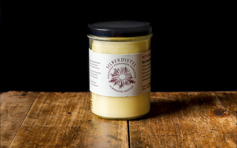 Das Fett stammt ausschliesslich aus dem Nierenfett vom Angus Rind von Cäsar Bürgi, der grossen Wert auf Tierwohl und Nachhaltigkeit legt. Es schmeckt relativ neutral und hat eine sehr feste Konsistenz. Im Unterschied zu pflanzlichen Fetten wie Raps- und Sonnenblumenöl hat es von Natur aus eine feste Konsistenz, enthält keine Zusatzstoffe und muss nicht gehärtet werden. Rinderfett kann sehr stark erhitzt werden und eignet sich darum besonders zum Backen, Braten und Frittieren. Zum Beispiel können damit wunderbar knusprige Bratkartoffeln zubereitet werden.
