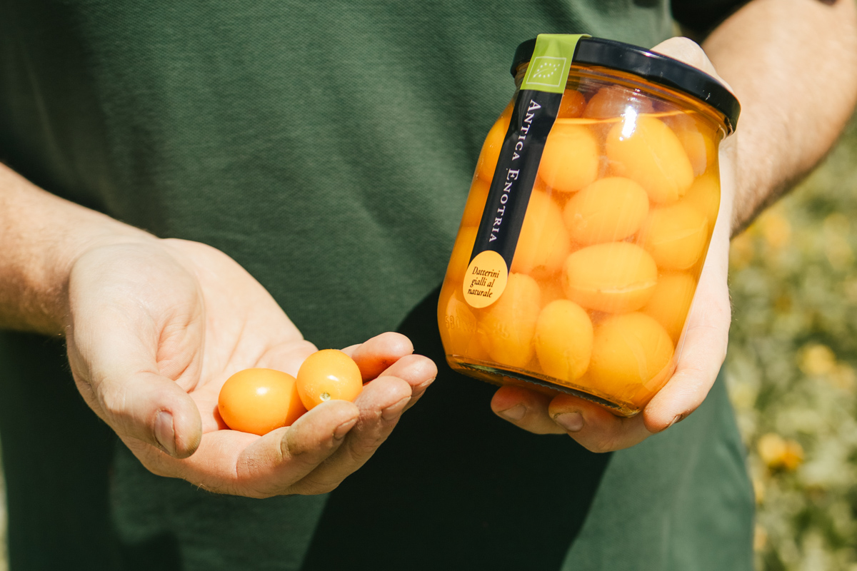 - Qualitätsmerkmale: Für den einzigartigen Geschmack dieser gelben Datterini Tomaten gibt es diverse Gründe: viel Sonne, natürlicherweise salzhaltige Kalkböden, wassersparende Tröpfchenbewässerung. Damit dieser Geschmack auch ins Glas kommt, achten Luigi und sein Team der Antica Enotria auf grösste Sorgfalt bei Ernte und Verarbeitung. Nur die wirklich reifen Tomaten werden geerntet und noch am gleichen Tag auf dem Hof verarbeitet. Neben der höchstmöglichen Qualität bringt dieses Vorgehen einen weiteren Vorteil: Die Erntespitzen werden etwas aufgefangen und die Mitarbeitenden können über einen längeren Zeitraum angestellt werden.
