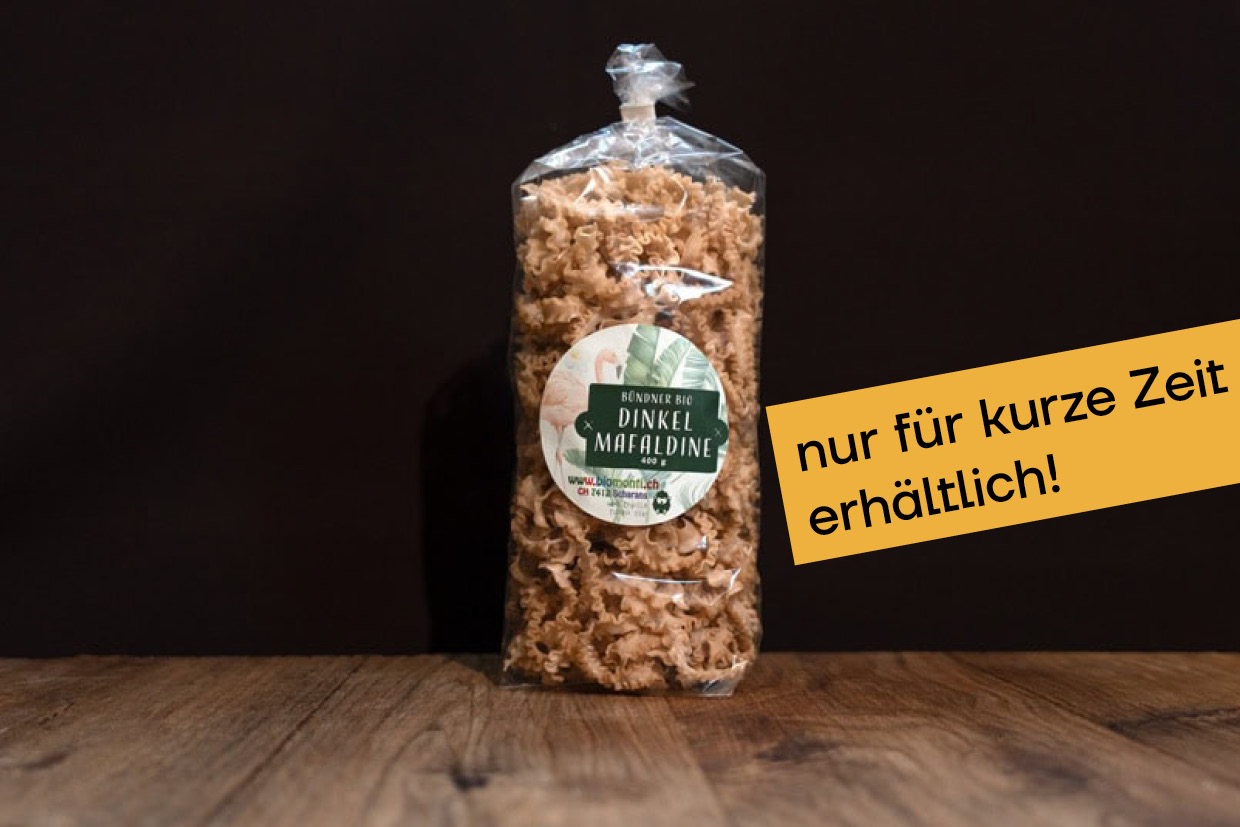 Die alte Dinkelsorte «Ostro» wird von der Familie Buchli im Domleschg biologisch angebaut und gleich auf dem Bauernhof zu Pasta verarbeitet. Diese Pasta besteht zu 100% aus Dinkelmehl und hat einen kräftigen Geschmack.