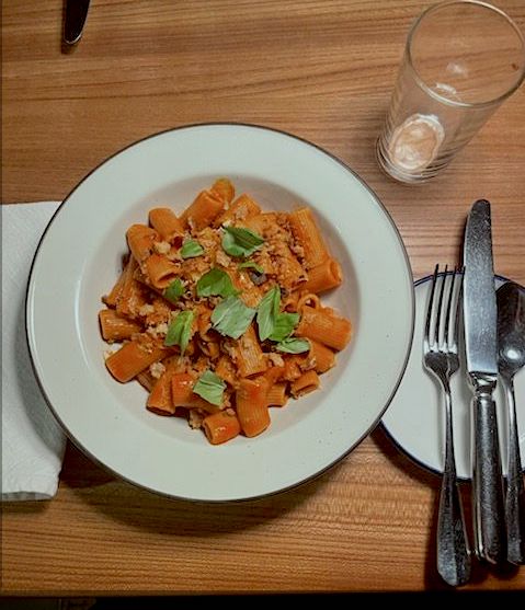 Simpel, aber wirkungsvoll: Die Rigatoni mit Tomatensugo von unseren Partnern „Im Franz“ sind ein tolles, veganes Alltagsgericht.