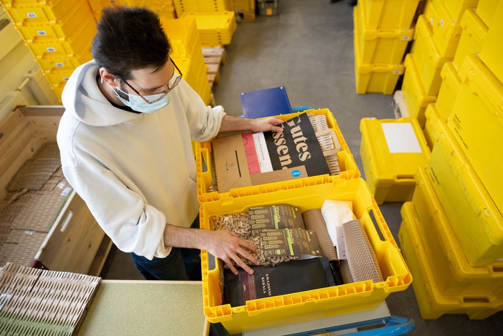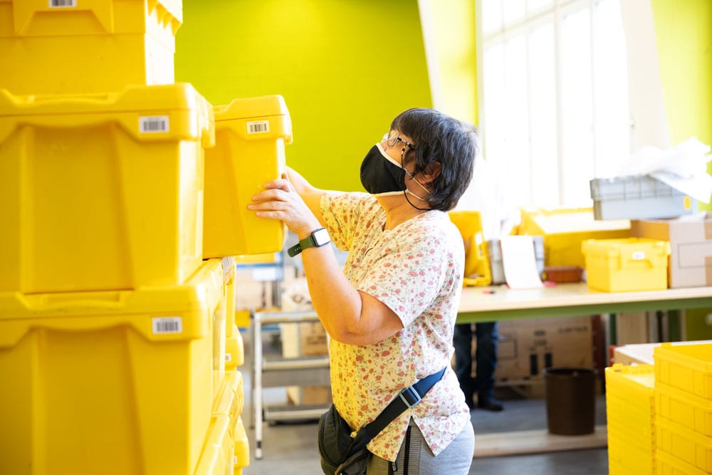 Kund*innen-Logistik 2021: In der Stiftung Züriwerk werden die Sammelbestellungen in Mehrweg-Dispoboxen umverteilt.