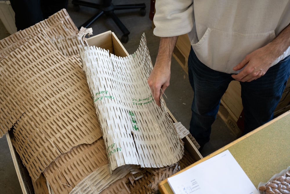 «Keep it simple» könnte man meinen. Doch wer genau hinschaut, der weiss: Das «Picken», also das korrekte Zusammenstellen und sichere Verpacken der Produkte anhand eines Lieferscheins ist eine Kunst und erfordert Zeit und Konzentration. Im Züriwerk wird für jede Sammelbestellung eine «Picking-Strasse» aufgebaut, in der die Paletten aus den Containern ihren Platz finden und mit grossen Produktbezeichnungen beschriftet und nach Kategorien sortiert aufgereiht sind. Innerhalb von 10-15 Arbeitstagen werden die rund 1’000 Pakete einer Sammelbestellung dann der Post übergeben. Und bereits trifft der nächste Container mit neuen Produkten ein. Es gibt also keine Zwischenlagerung und keinen Zwischenhandel. Die Herkunft der Produkte ist immer 1:1 nachvollziehbar. Sie kommen just in time an und werden umgehend verteilt. So können wir auch ohne schlechtes Gewissen von «direkt» sprechen – mit einem kleinen Umweg über die Kundenlogistik.