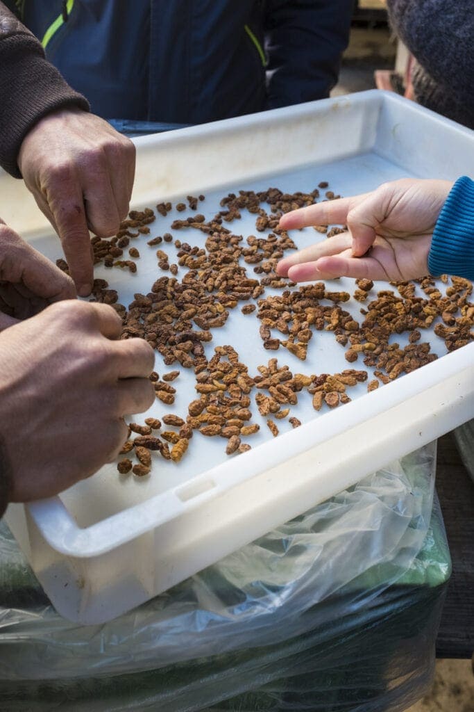 Wir haben an diesem Tag Erdmandeln geerntet und sortiert, aber eigentlich hatten wir es gemütlich gehabt dank der tüchtigen Feldmäuse. Sie bunkern fleißig die Knöllchen der Pflanze als Wintervorrat in ihrem Bau – unterirdische Kammern, die nur darauf warten abgeräumt zu werden. Erdmandel sind unscheinbare Energiekraftwerke, die ihren oberirdischen Namensverwandten in Geschmack und Aroma in Nichts nachstehen. Sie werden für die Gastronomie weiterverarbeitet als Mus, Mehl, Flocken. So werden Produktionskreisläufe bei Slow Grow geschlossen, denn man arbeitet eng mit der Gastwirtschaft Jakob oder mit BachserMärt zusammen. Zumal finden die Gemüsekisten zu ihren Bestimmungsorten mittels klimafreundlichem Transport (SBB, Elektrovelo).