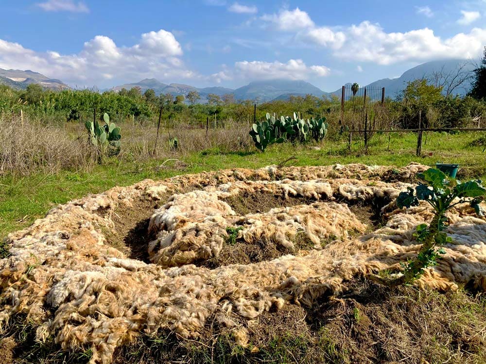 Walter begleitet uns auch nach Partinico zur Cooperativa Sociale NoE (No Emarginazione), wo der von uns mitinitiierte Food Forest realisiert wird. Hier lernen wir Carla, die Seele von NoE, und Rafael, Ökologe an der Uni Palermo, der die Entwicklung des Agroforstprojekts wissenschaftlich begleitet, kennen. Es wird eine sehr erkenntnisreiche Führung durch das vielfältige Gelände. Gaspare, ein langjähriger Mitarbeiter von NoE, sorgt per Lautsprecherbox für die musikalische Begleitung (klassische Musik oder alte italienische Canzoni). Wer weiss, vielleicht wachsen die Pflanzen sogar noch besser so? Für einen guten Schwung bei der Arbeit hilft die Musik sicher. Und nein: Bei der schönen Spirale am Boden handelt es sich nicht wie von mir vermutet um ein Kunstprojekt, sondern hier läuft ein Experiment, den Boden mit anderweitig nicht verwertbarer Schafswolle zu mulchen, also zu schützen und zu nähren.