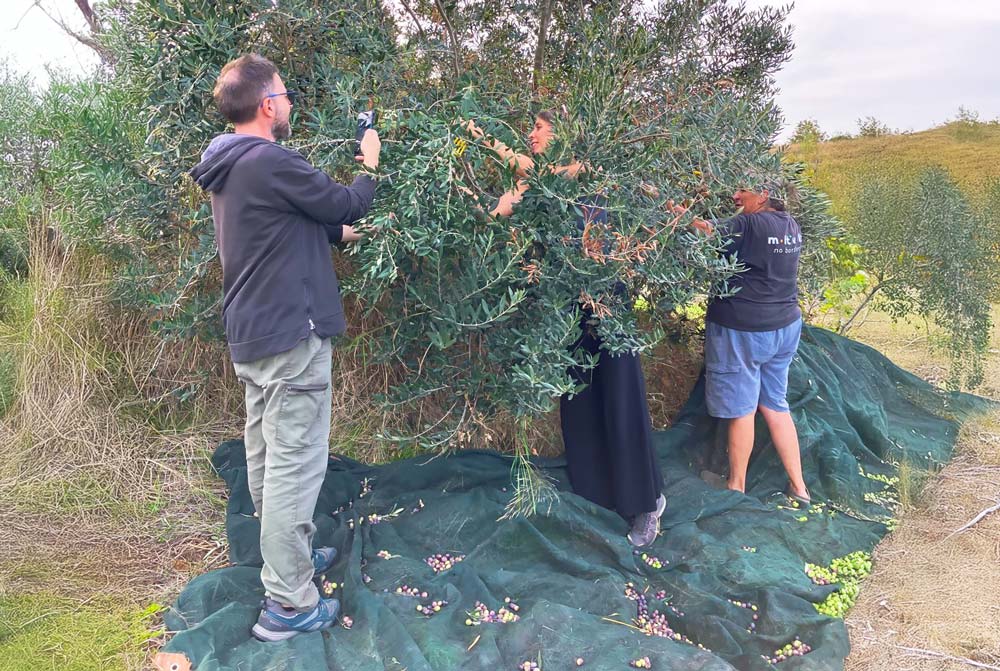 Nach einem geselligen Mittagessen unter dem grossen Maulbeerbaum – am Tisch wird italienisch, englisch, etwas deutsch, natürlich auch schweizerdeutsch und wenn nötig mit Händen und Füssen gesprochen – gilt es für uns Gäste bei der Olivenernte anzupacken. Mir war gar nicht bewusst, wie viel diese Arbeit mit dem täglichen Bürsten der Haare gemein hat: Der Olivenbaum wird ja praktisch ausgekämmt…